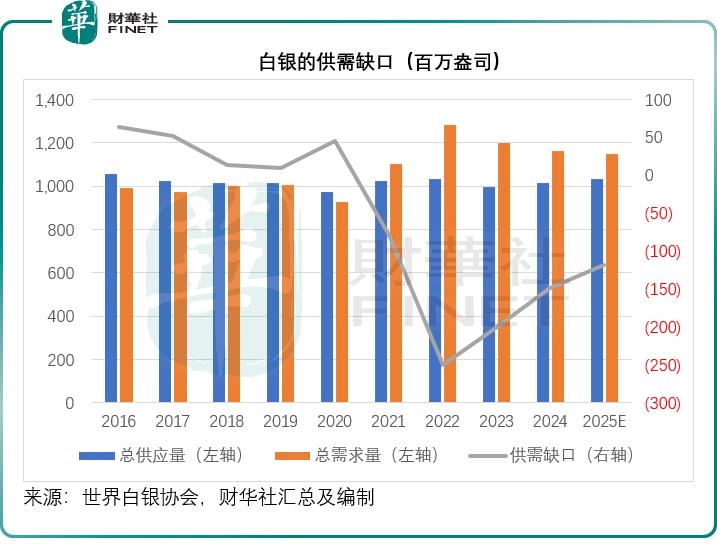 2) 供应缺口持续:白银在工业领域也有广泛的引用,例如光伏、新能源汽车生产等工业领域都需要用到白银,这给银价提供了刚性支撑,同时钱币铸造、实体商品 ETF 投资需求殷切也推动了对银的需求,但另一方面,世界白银协会的数据显示,不考虑 ETP(交易所交易产品) 的投资,今年白银的供应缺口仍高达 1.18 亿盎司,见下方截图,自 2021 年以来,白银就一直处于供应缺口。