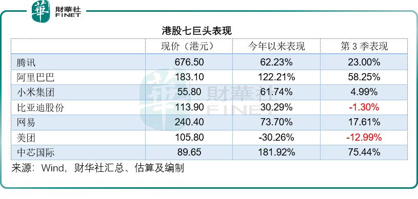 引领港股和中概股大盘表现的是中国的科技巨头,财华社统计了港股 (市值) 七巨头的表现,市值最高的腾讯 (00700.HK) 和阿里巴巴 (09988.HK) 今年均有不俗表现,累计涨幅分别达到 62.23% 和 122.21%,第 3 季累计涨幅则分别达到 23.00% 和 58.25%。