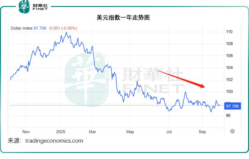 今年的美元指数持续下降,从年初的 108.49,下降至当前的 97.706,累计降幅达到 9.94%,结合时间线与指数走势图可以看出,特朗普上台后,美元指数一举跌破 100,并持续向下,见下图。
