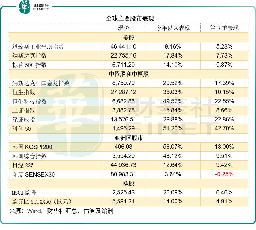 2025 年第 3 季,韩国 KOSPI200 指数和韩国综合指数的累计涨幅分别只有 13.09% 和 9.51%,而恒生指数和恒生科技指数的季度累计涨幅却分别达到 10.15% 与 22.55%,“ 百年不动” 的 A 股也有了“ 动一动” 的行情,上证指数、深证成指和科创 50 的第 3 季累计涨幅分别为 8.66%、22.86% 和 42.70%,跑赢全球大部分股市。