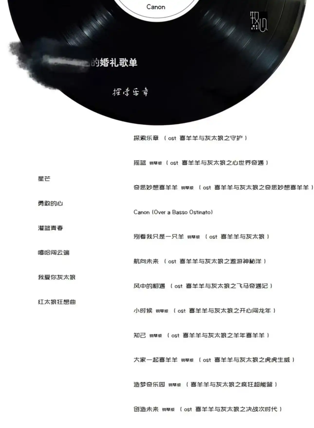 除了场地置景外,婚礼进行曲的歌单都是我亲自敲定的,里面的歌曲分别来自 《喜羊羊与灰太狼》 不同系列的插曲,如 《别看我只是一只羊》《奇思妙想喜羊羊》《风中的相遇》《小时候》 等等。