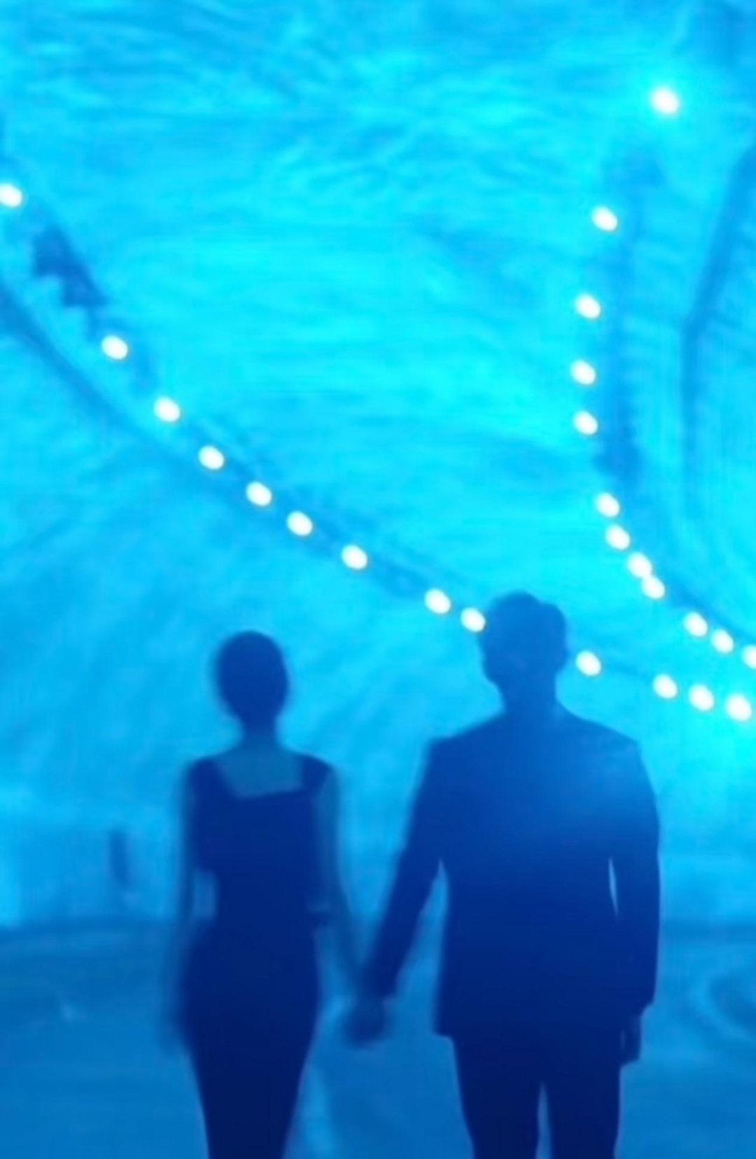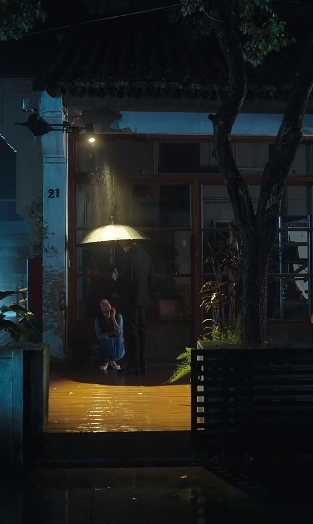 此外,漫长的蓝色隧道中二人并肩散步,冷调氛围更显暧昧;女主无助时,画面先切入一把为她撑伞的背影,而后才出现男主的脸—— 这种 「尊重式关」 的呈现方式,反而更拉近了两个人的距离。这些镜头不仅是美的,更直接参与了人物内心世界的构建。