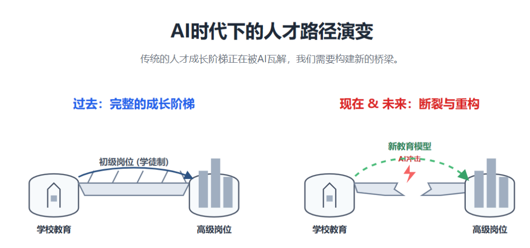 当一家公司可以用极低的成本,让 AI 完成 90% 的初级工作时,雇佣一个需要支付薪水、需要耗费心力去培养、且效率远低于 AI 的人类新手,在商业逻辑上变得越来越不划算。(情怀恐怕无法对冲这种本质性变化)