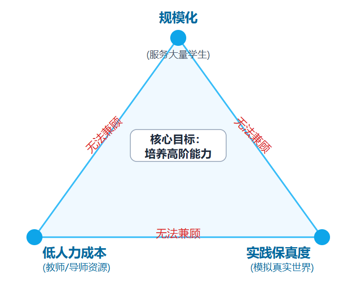 过去模式的核心是“ 教师授课-学生听讲-有限实践”,它在知识传递上或许有效,但在培养上述高阶能力时,却陷入了一个“ 不可能三角”:教育的规模化、实践的保真度和教师的人力成本。