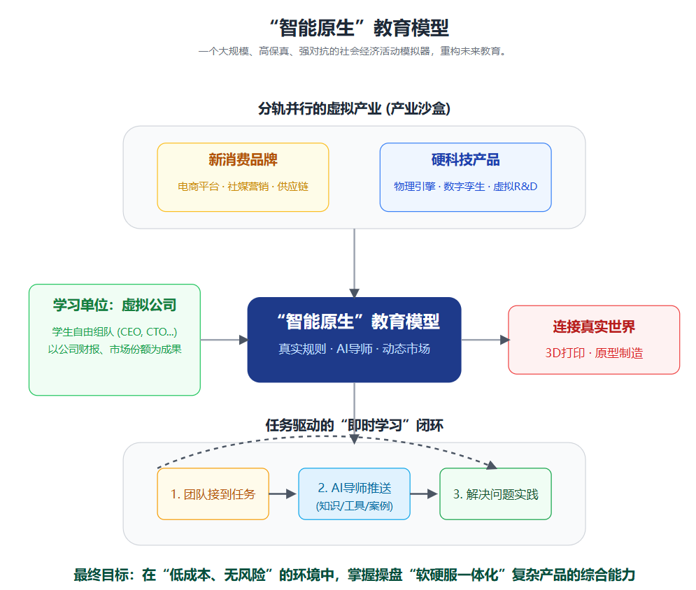 1. 分轨并行的虚拟产业: 在早期阶段将构建多个并行的、高度专业化的虚拟产业环境。例如,会有一个专注于“ 新消费品牌” 的模拟世界,它内置了完整的电商平台、社交媒体营销工具链和柔性供应链系统;同时,也会有一个专注于“ 硬科技产品” 的模拟世界,它提供了先进的物理引擎、数字孪生接口和虚拟研发实验室。每个“ 世界” 都是一个自洽且高度仿真的产业沙盒,让学生可以沉浸在特定领域的真实挑战中。