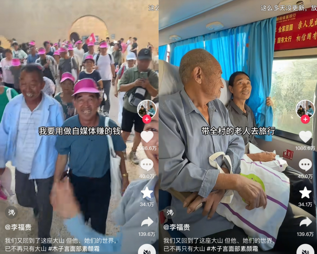 而论今年三农领域的涨粉黑马,记录农村卖货生活的 @李福贵 必然榜上有名。8 月份时,@李福贵 凭借 「带着全村老人去旅游」 的视频迅速出圈,单月涨粉近 200 万;截至日前,她在抖音粉丝数量达 1196 万。