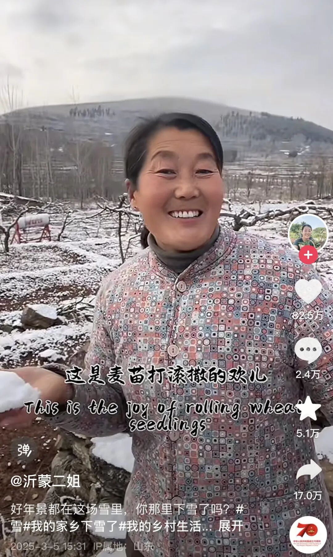 「这是雪吗?这不是雪,这是老天爷撒的糖霜盐,这是麦苗打滚撒的欢儿,这是老把式笑纹里淌出的农谚。这是雪吗?这不是雪,这是蓑衣汉子立田埂,钓起的三亩墒情,这是银梭子穿过针眼,给麦苗纳千层底的展现…」 很多网友初识 @沂蒙二姐,是从今年 3 月她以雪赋诗的这段视频开始的。