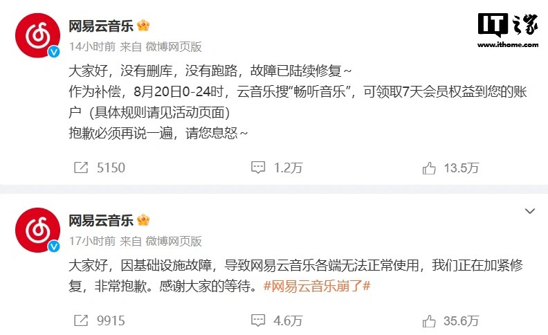 今日 (8 月 20 日)0 点~24 点,网易云音乐开放补偿 7 天会员权益,用户可以前往网易云音乐 App 搜索 「畅听音乐」,在顶部的活动页面免费领取会员补偿。