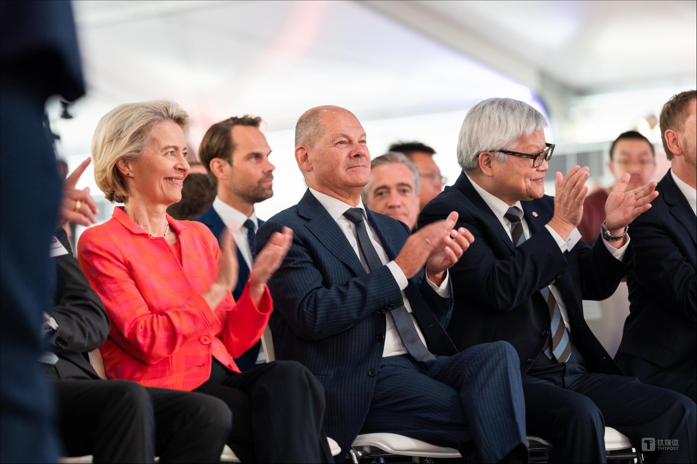 欧盟委员会主席冯德莱恩 (左三)、台积电董事长魏哲家 (左四)、德国总理朔尔茨 (左五) 参加在德国德累斯顿举行的 ESMC 奠基仪式 (图片来源:TSMC)