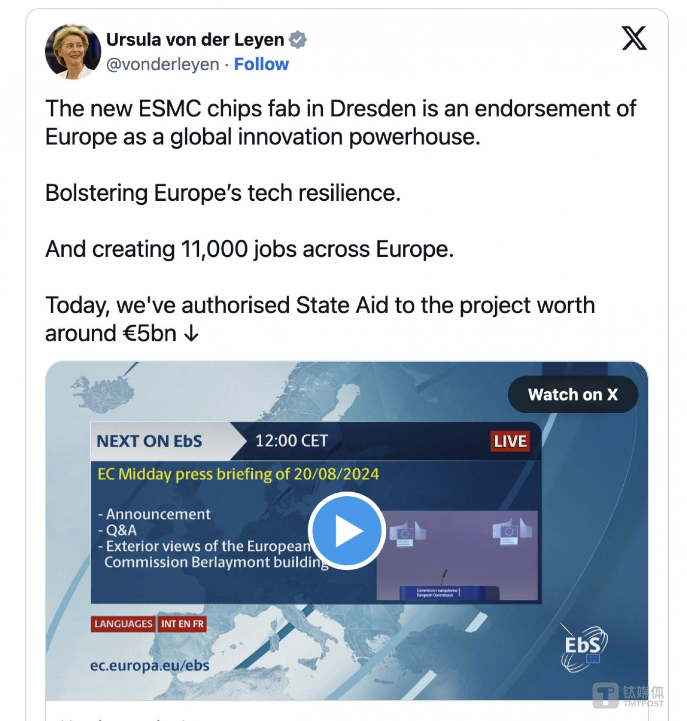欧盟执委会主席冯德莱恩 (Ursula von der Leyen) 则直接宣布,欧盟执委会已依据欧盟国家补助规则 (EU State aid rules) 通过一项 50 亿欧元 (约合人民币 395.96 亿元) 对德国的补助措施,以支持 ESMC 半导体晶圆厂的建设工程和营运。