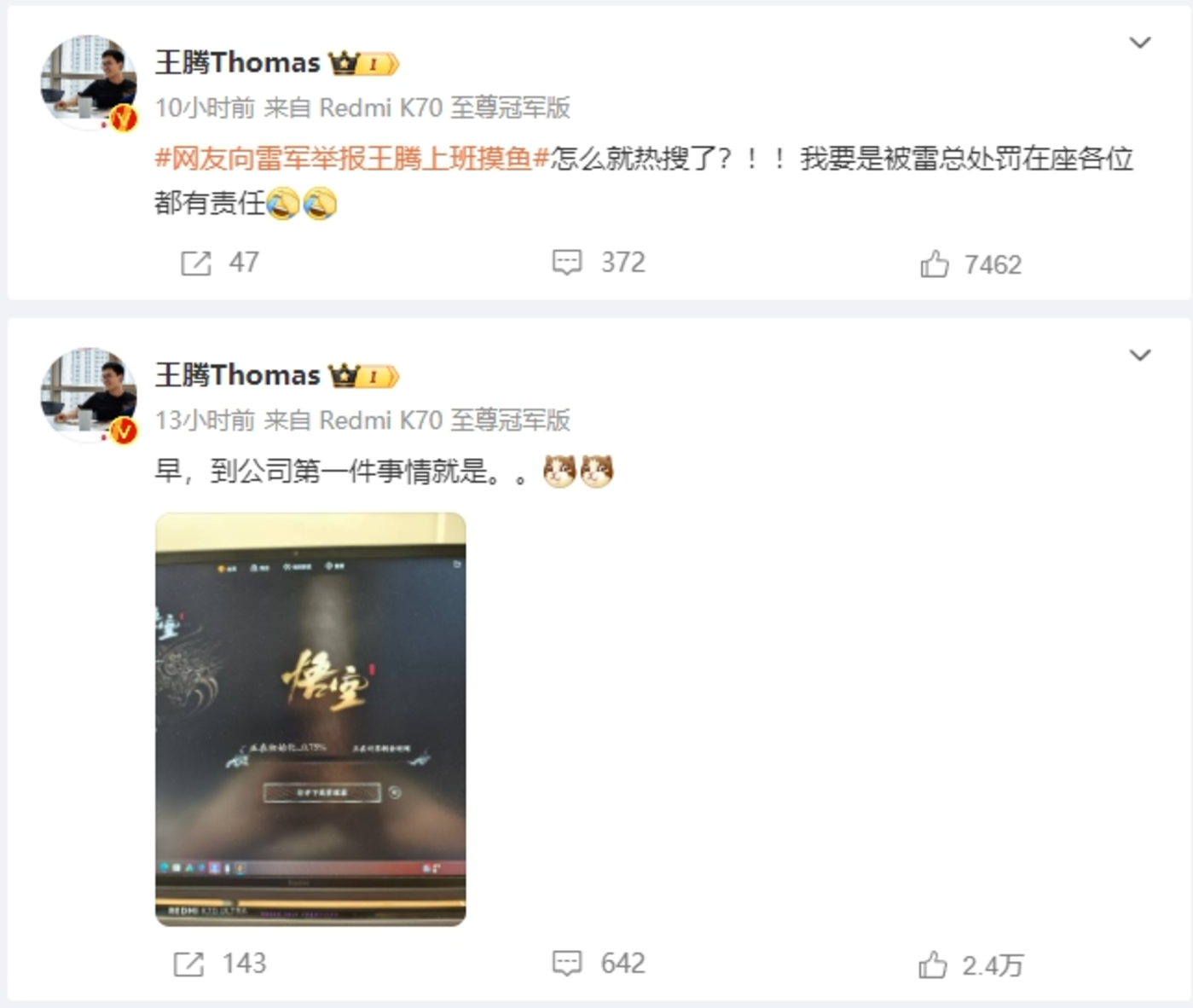 例如,小米中国区市场部副总经理、Redmi 品牌总经理王腾在微博上分享了他到公司后第一件事就是预下载 《黑神话:悟空》 的经历,这一举动引发了网友的广泛关注,甚至有人调侃他是在 「上班摸鱼」,此事迅速成为网络热议话题。