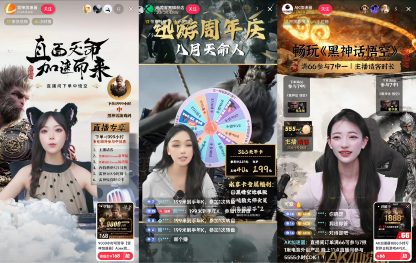 例如,加速器企业如雷神加速器、迅游加速器、AK 加速器等,在直播间中积极打出 「直面天命,加速而来」 的宣传口号,通过充值会员并抽奖送游戏的方式吸引用户。