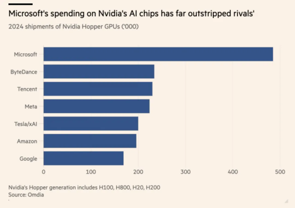 另一家巨头微软也是 GPU 的大买家。科技咨询公司 Omdia 的分析师估计,微软在去年购买了 48.5 万块英伟达的 「Hopper」 芯片。这使得微软远远领先于英伟达的第二大美国客户 Meta(购买了 22.4 万块 Hopper 芯片),以及其云计算竞争对手亚马逊和谷歌。