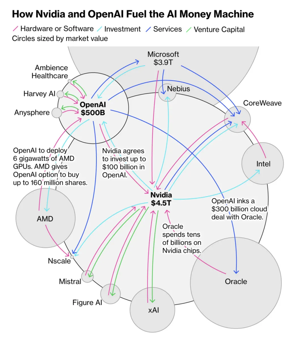 此前从未有过如此巨额的资金被如此迅速地投入到一项尽管潜力巨大,但其盈利能力在很大程度上仍未经证实的技术上。而这些投资通常可以追溯到两家领先的公司:英伟达和 OpenAI。近期,两大巨头之间发生的一系列交易和合作加剧了人们的担忧:日益复杂且相互关联的商业交易网络正在人为地支撑着价值数万亿美元的人工智能热潮。几乎每个经济领域都面临风险,人工智能基础设施的炒作和建设波及了各个市场,从债务、股票到房地产和能源。