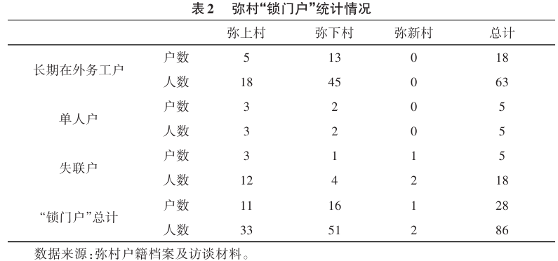 表 2 是三个自然村 「锁门户」 的统计情况。就现实情况来看,长期在外务工户通常有亲属在村内生活,春节前仍然要举家回村过年,春节后再离村。失联户数量不多,总计只有 5 户 18 人。单人户只有 5 户,全部属于儿女在外工作定居且户口已经迁出,将老人接出村庄生活的情况。
