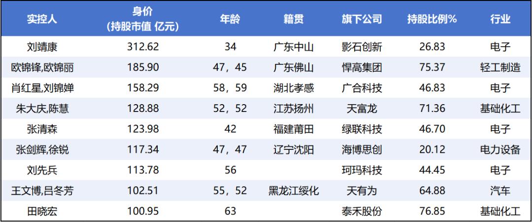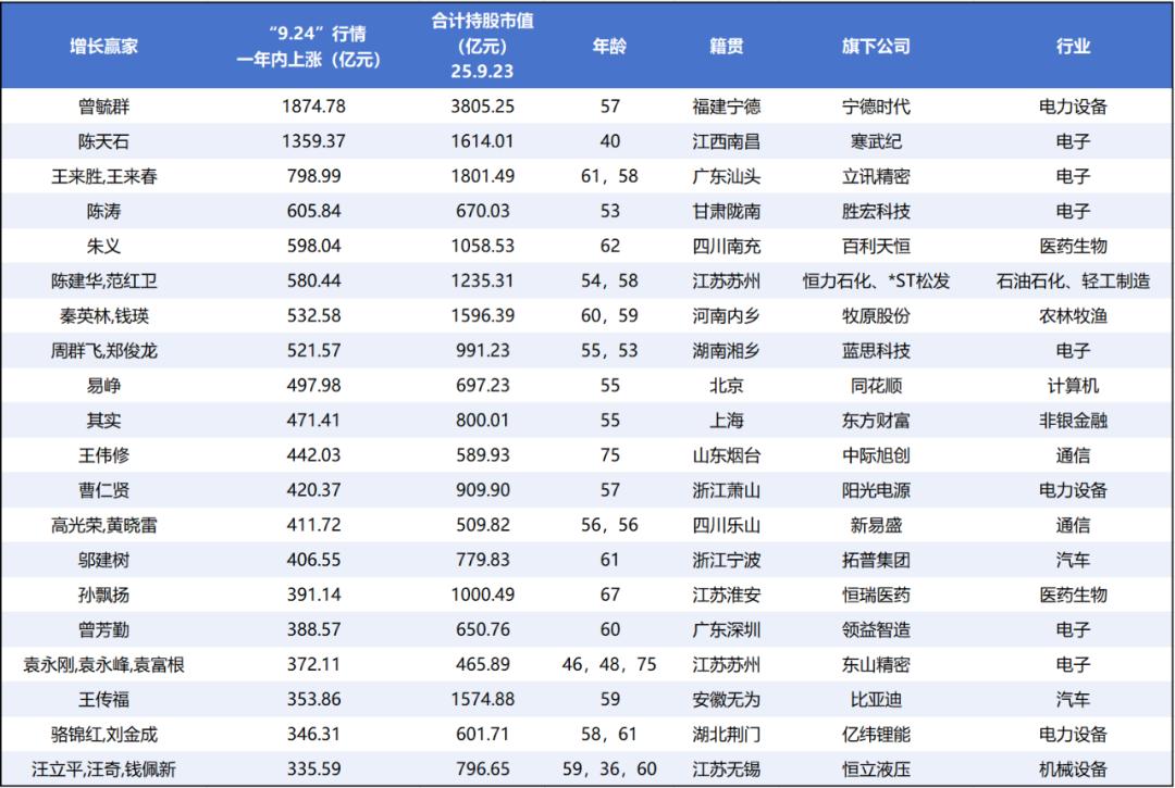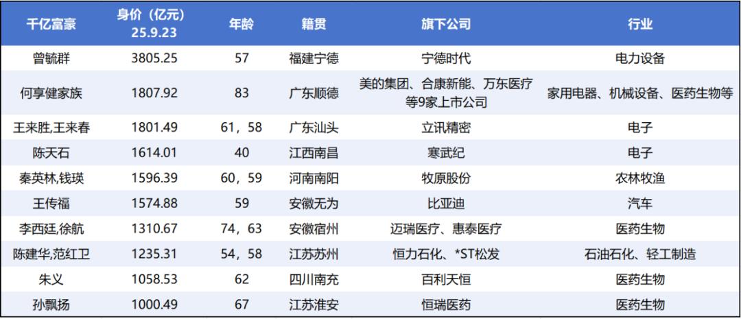 “9·24” 行情一周年之际,除国资控股公司外,共有 10 家公司的实控人或其家族跨越了持股市值超千亿的门槛,跻身千亿富豪之列。包括宁德时代曾毓群,美的何享健家族,立讯精密王来胜、王来春兄妹,寒武纪创始人陈天石等。