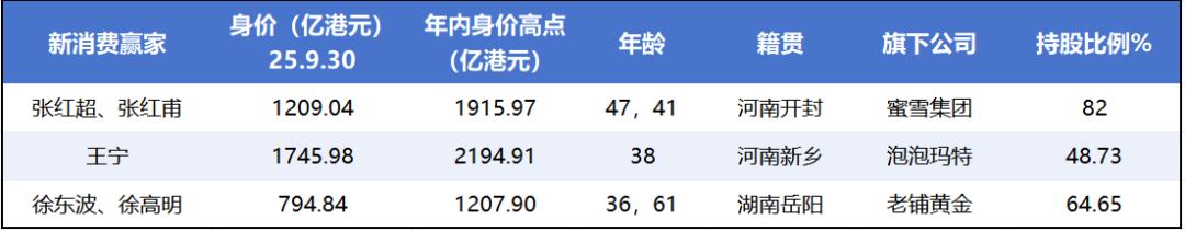 当然,并非所有赢家都挤在科技赛道。在新消费赛道中,也跑出了蜜雪集团创始人张红超、张红甫,泡泡玛特创始人王宁,老铺黄金实控人徐高明、徐东波三组财富赢家。其中,张氏兄弟的身价为 1209 亿港元,王宁的身价为 1746 亿港元,徐氏父子的身价为 795 亿港元。