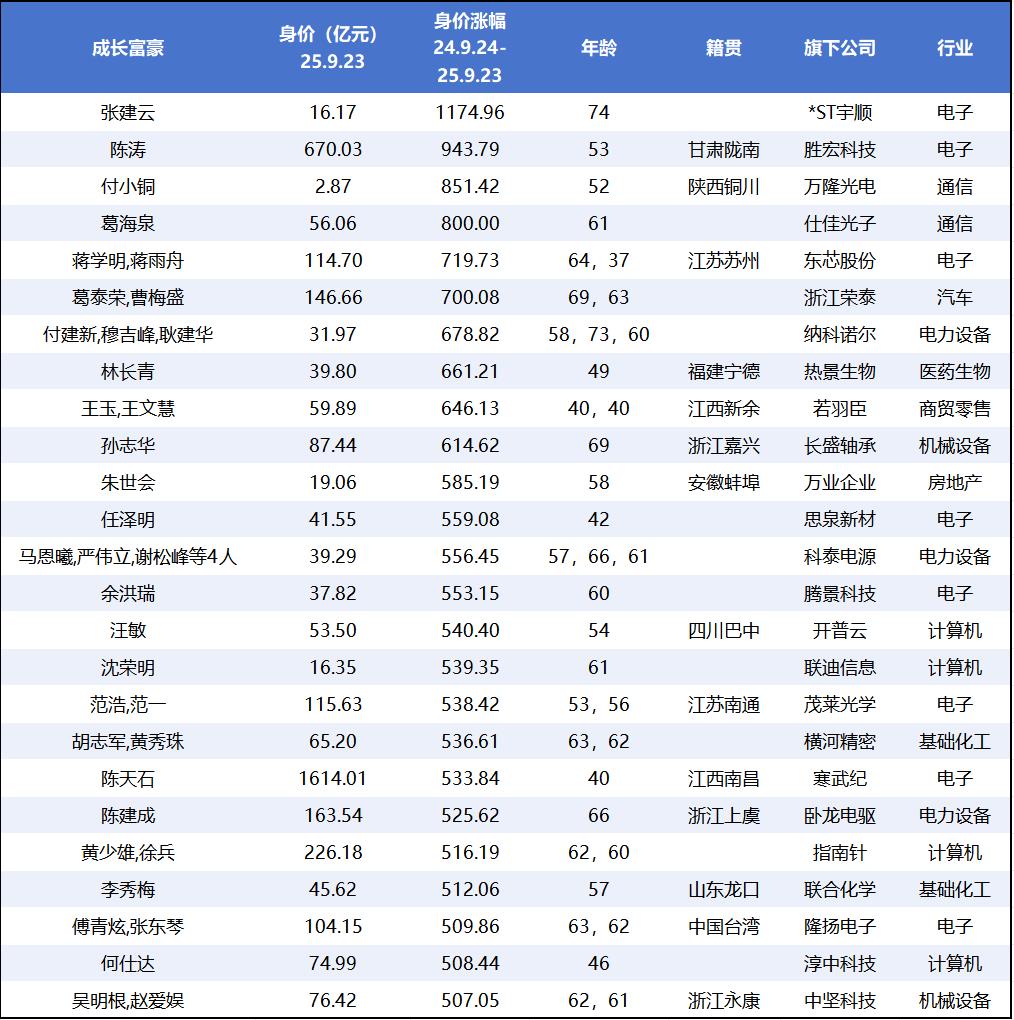 除上述增长赢家外,许多中小规模公司的实控人也在此轮牛市中获益。这些成长富豪的身价增量算不上高,但增速较快。“9·24” 后的一年中,A 股共有 25 位富豪的持股市值实现了 5 倍以上的增长。其中,74 岁的*ST 宇顺实控人张建云排名第一,身价累计涨幅超 10 倍。