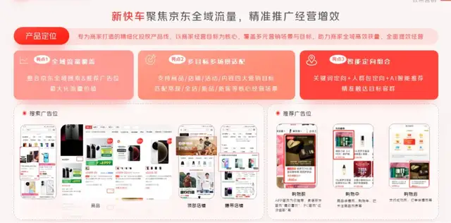 在商家侧,京东则重点布局 AI 数字人直播,主要为中小商家及非黄金时段提供低成本、可持续的带货解决方案。官方数据显示,在今年 618 期间已有超过 1.7 万家品牌商家采用。同时今年双 11,京东还提到了整合搜索快车、推荐广告、智能投放三大产品的“ 新快车”,也叠加上了 AI 能力,可以助力商家实现全域流量覆盖与多场景智能营销。