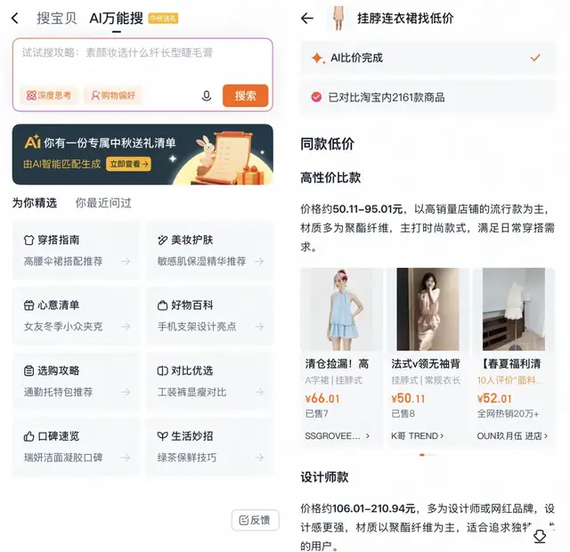 淘宝在今年 8 月推出“AI 万能搜”,9 月内测“AI 助手”,同期在拍立淘中落地“AI 找低价” 功能。这三款产品分别覆盖关键词搜索、图片搜索与搜索结果优化,共同构建起以 AI 为核心的搜索交互矩阵,旨在提升用户找货效率与决策体验。