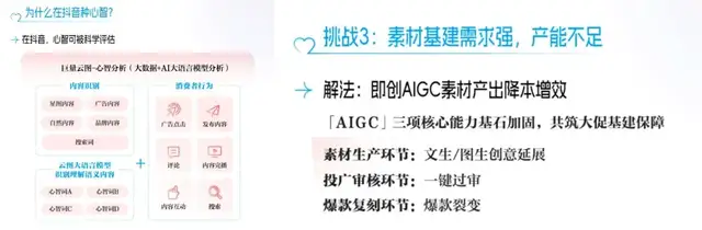 抖音电商的 AI 应用则有更鲜明的内容生态烙印。比如巨量云图整合了大数据与 AI 大语言模型技术,可以深度分析消费者行为与内容偏好,以此来帮品牌商家定位商品的核心卖点,发掘潜力营销场景等等,为后续营销内容打好了基础。在内容制作环节,“ 即创” 等 AIGC 工具则会帮商家更智能化生成营销素材。