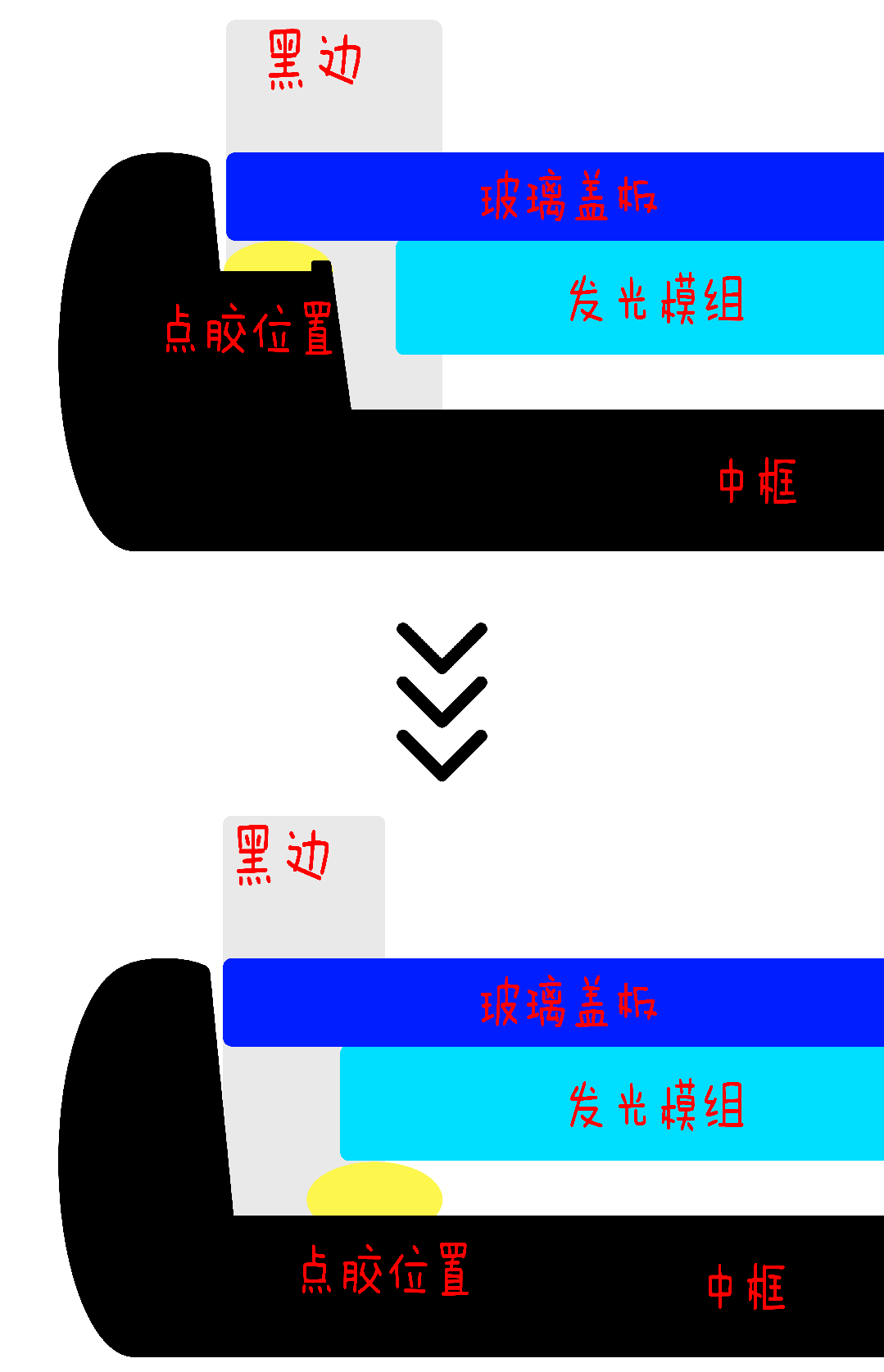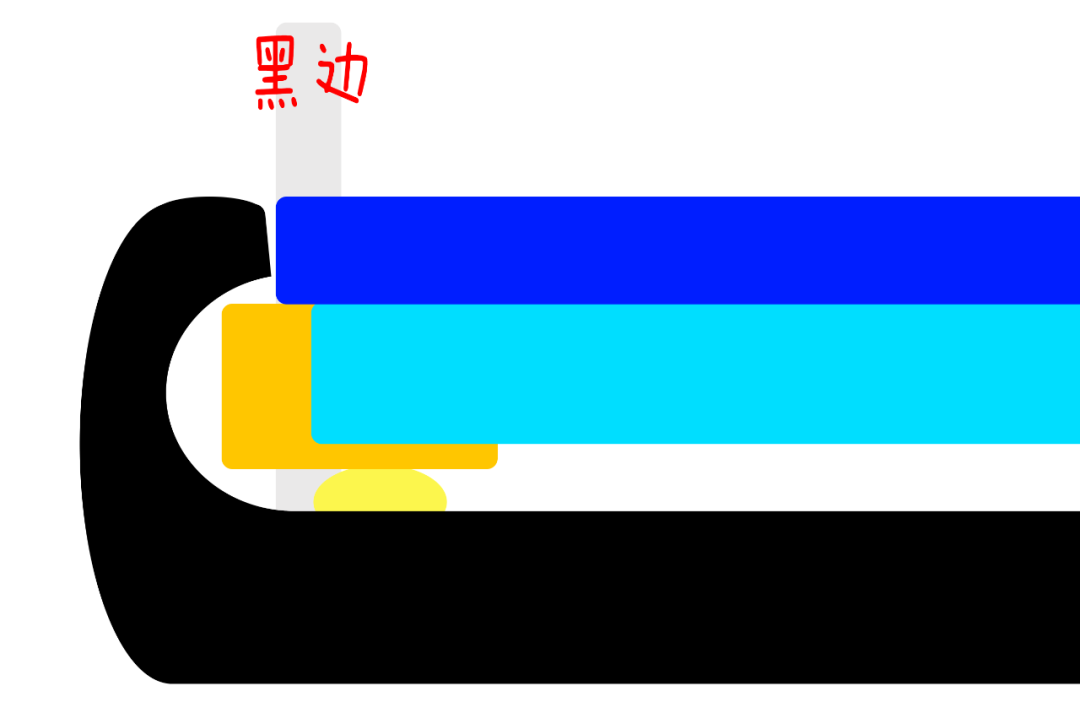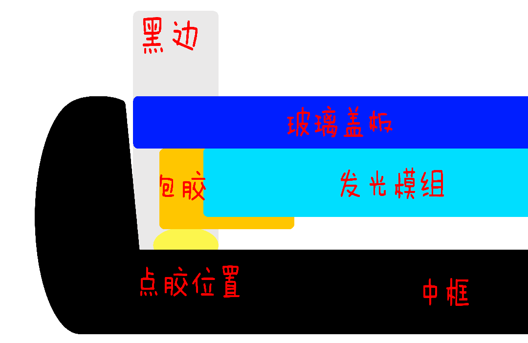 为了进一步降低黑边,他和同事们引入了一种方法,把点胶位置从玻璃盖板下方挪到屏幕模组下方:
