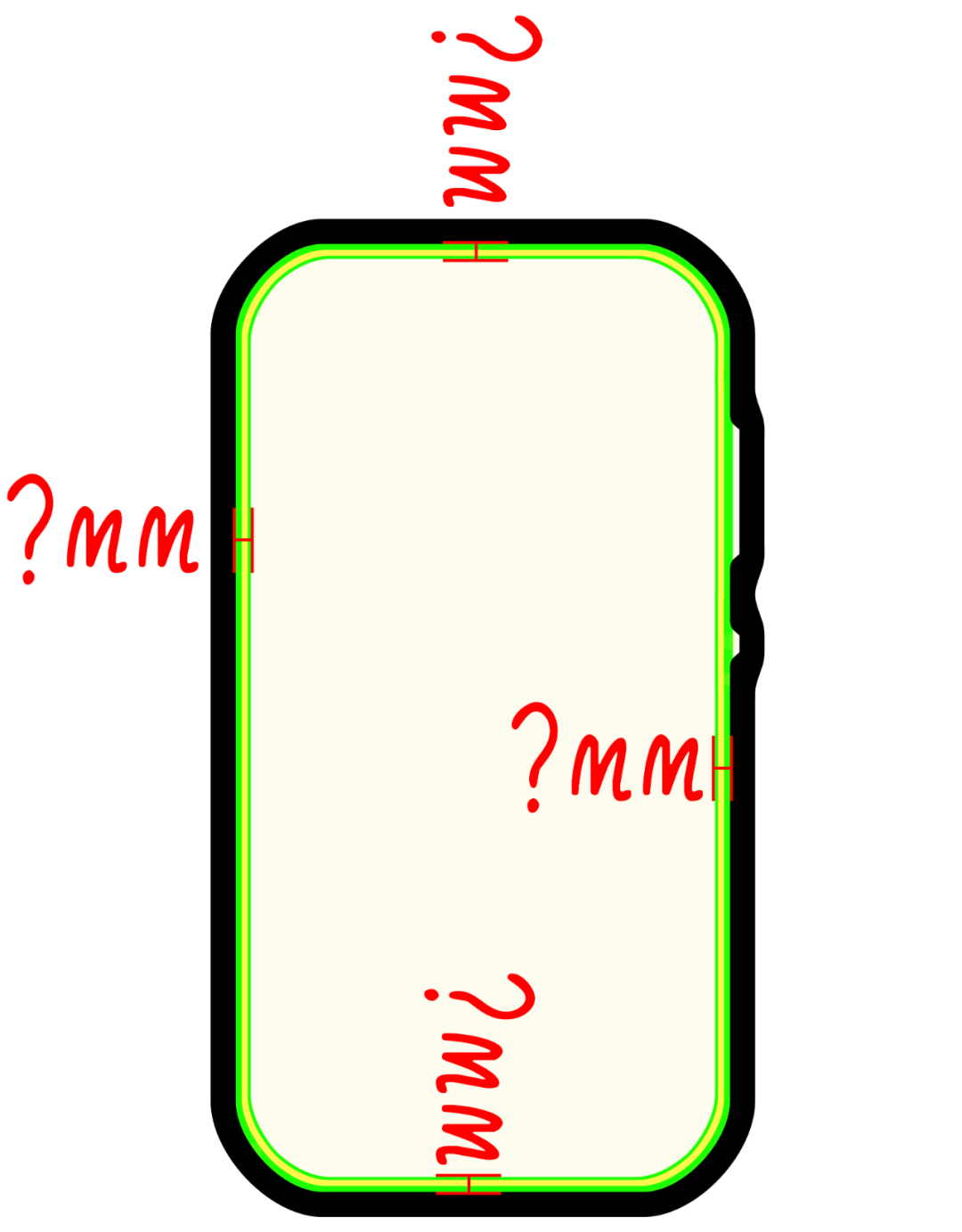 由于屏幕排线会从下方引出,所以这里需要额外增加胶水的厚度,以保护屏幕模组。这样一来,下边框的极限只能到达 1.45mm 左右。(为了整体四边等宽,其他三边被迫做宽了一丢丢。)