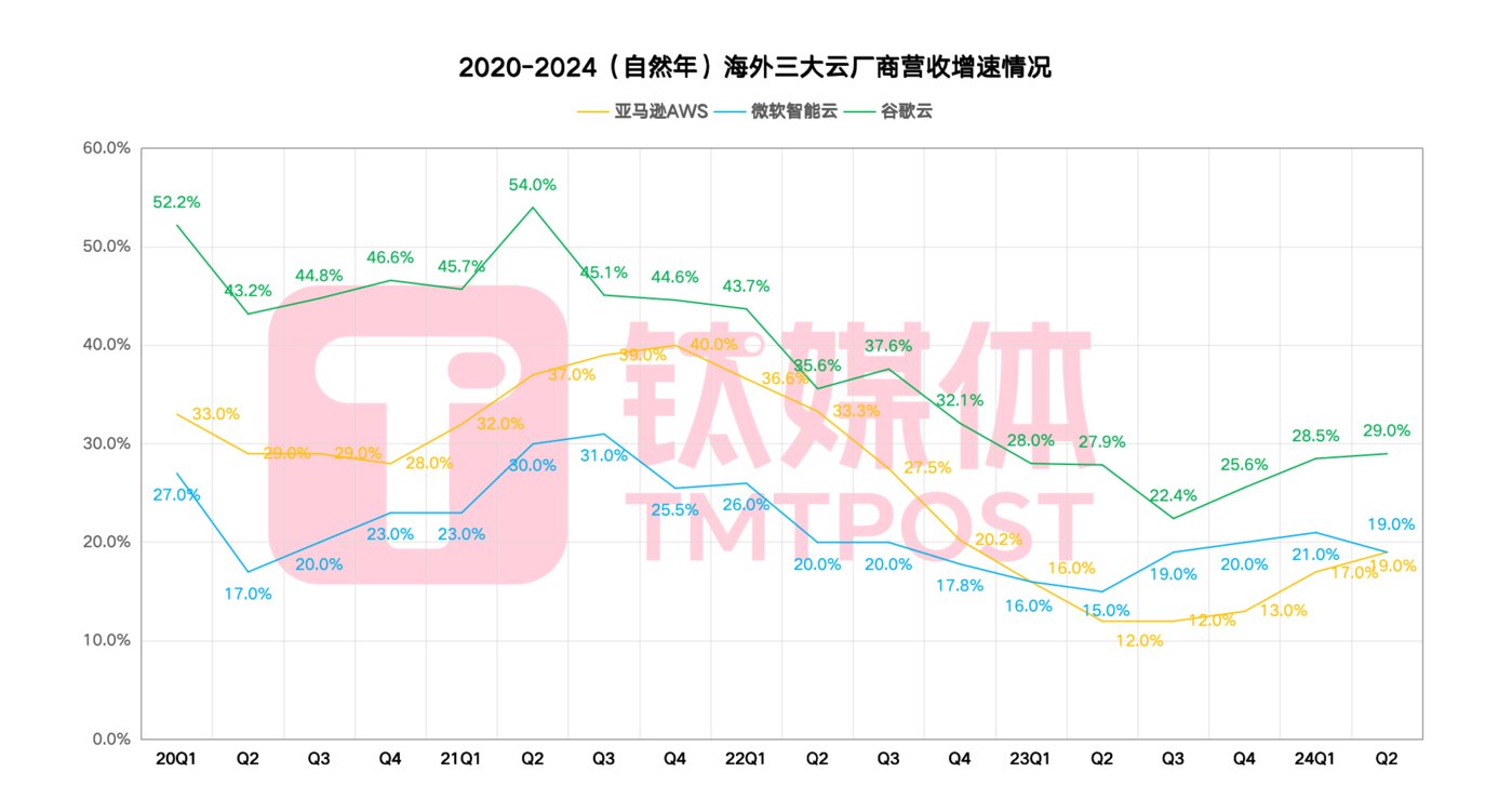 钛媒体 App 梳理数据发现,亚马逊云的营收增速在 2023 年第二季度滑到历史最低的 12% 以后,开始逐季度回升。2024 年第二季度,亚马逊云实现营收 263 亿美元,同比增长 19%,然而这一数据与 2018 年最高值的 45% 已不可同日而语;营业利润实现 93 亿美元,营业利润率 35.4%,同比增长 11 个百分点,略低于上个季度。