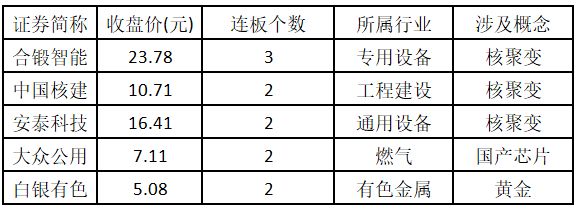 从连板情况来看,今日首板个股有 46 只;2 连板的个股有 9 只;3 连板及以上的个股有 1 只。今日连板数排名前 5 的个股包括合锻智能、中国核建、安泰科技、大众公用、白银有色,具体如下表所示。