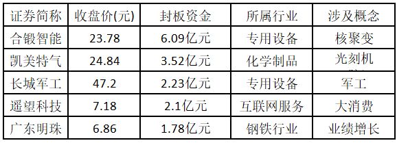 从封板资金来看,今日涨停板个股中,封板资金排名前 5 的个股包括合锻智能、凯美特气、长城军工、遥望科技、广东明珠。
