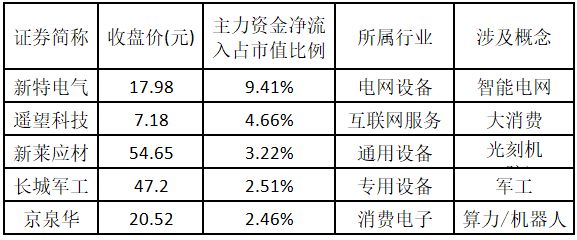 主力资金净流入金额占市值比例排名前 5 的个股分别为新特电气、遥望科技、新莱应材、长城军工、京泉华。欢迎大家关注微信公众号 「道达号」,「道达涨停复盘」 栏目为大家复盘市场涨停数据。