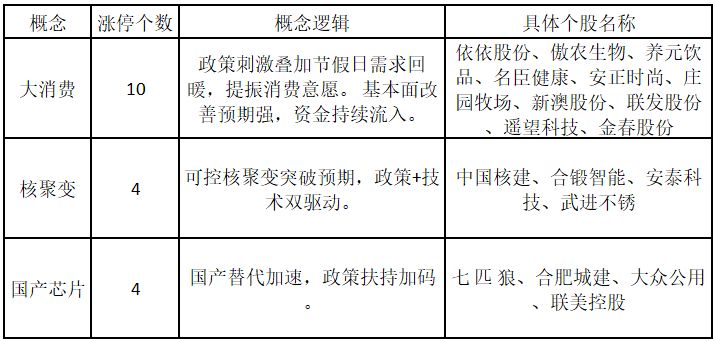 从概念特征来看,今日涨停板个股中,大消费、核聚变、国产芯片概念的个股最多。