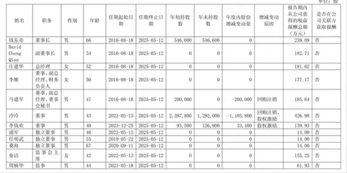 2024 年的财报数据显示,冷泠 2024 年在科沃斯的薪酬总额为 426.98 万元,远超钱氏父子薪酬甚至高于二者的总和,当然也数倍高于其他高管。
