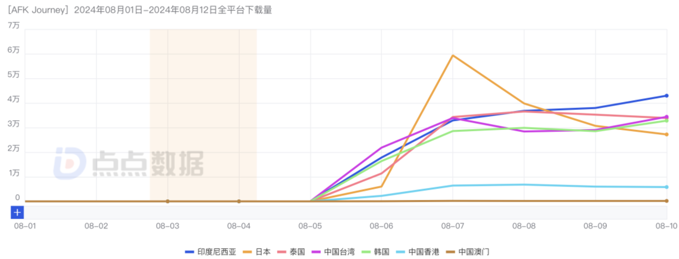 港澳台、日韩、印尼、泰国版本上线 3 天,《剑与远征:启程》 在双端预估下载量约为 80 万次。其中,东南亚、日本、中国台湾市场贡献较多的下载量。