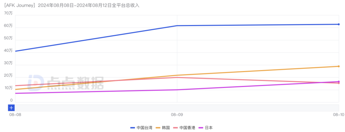 港澳台、日韩、印尼、泰国版本上线 3 天,《剑与远征:启程》 在双端预估收入 (扣除平台分成) 约为 3313 万元。其中,中国台湾市场是贡献了较多的收入。