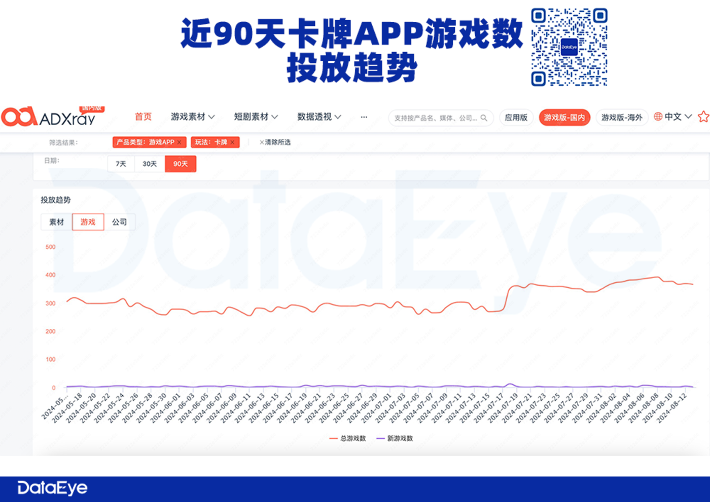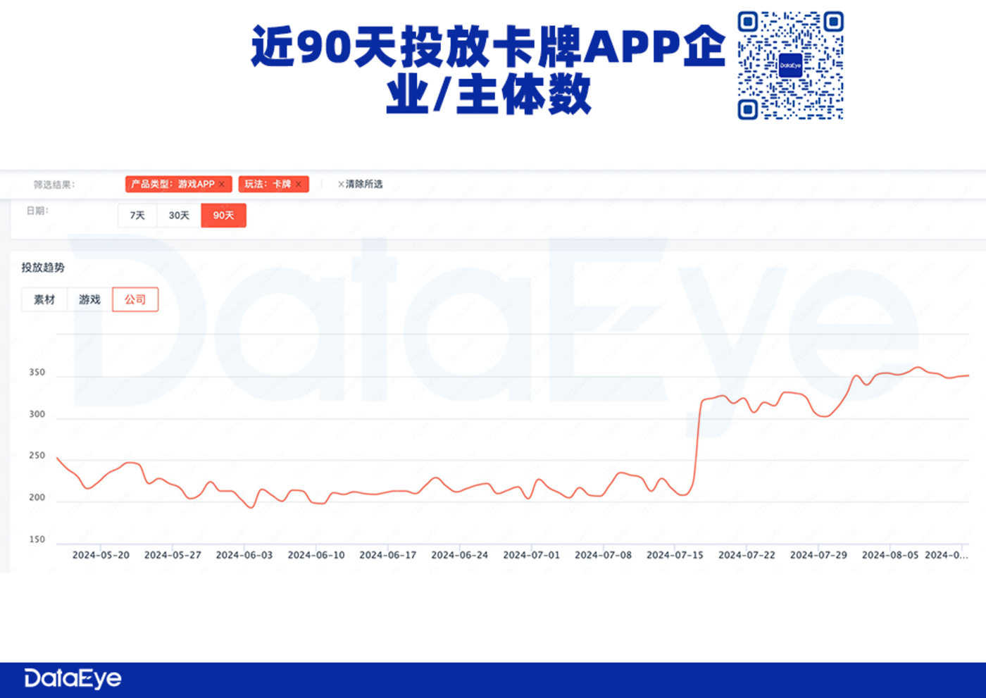 一是暑期档刺激大量厂商、游戏参投。内卷进行时,且尚未 「卷到头」。ADX 数据显示,卡牌赛道在投游戏 APP、公司/主体在近 90 天内呈现增长趋势,且还处于持续增长的趋势。这主要因为暑期档各产品抢量。