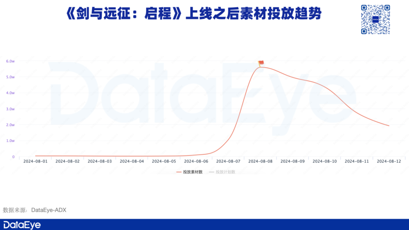 DataEye-ADX 数据显示,《剑与远征:启程》 上线当天素材投放量超 5.5 万 (视频+图片,其中图片素材的占比约为 60%),但后续投放量呈下滑趋势。