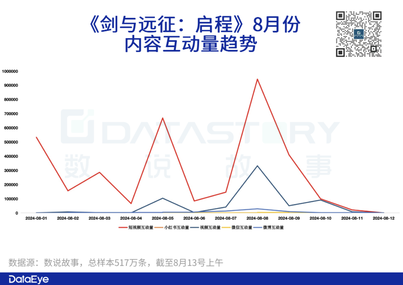 互动量 (赞、转、评、投币、收藏等) 方面:截至 8 月 13 日,《剑与远征:启程》 互动量高达 517 万次,而主要集中在短视频平台 (抖、快)。此外,在中长视频平台 (B 站) 也有不少的互动量。