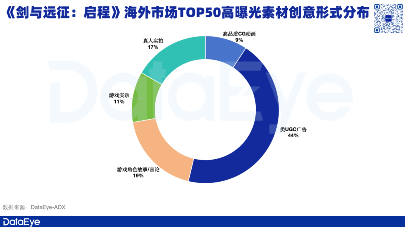 海外 7 个市场,《剑与远征:启程》 高曝光量素材创意分布中,类 UGC 素材占比约为 44%,其次则是游戏角色故事/言论素材,占比约为 19%,同时,真人实拍素材也有 17% 的占比。