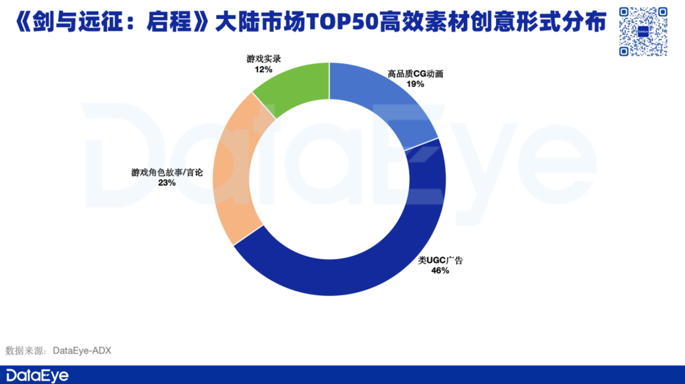 DataEye-ADX 数据显示,大陆市场,《剑与远征:启程》 高效素材创意分布中,类 UGC 素材占比约为 46%,其次则是游戏角色故事/言论素材,占比约为 23%,同时,高质量 CG 动画素材也有 19% 的占比。