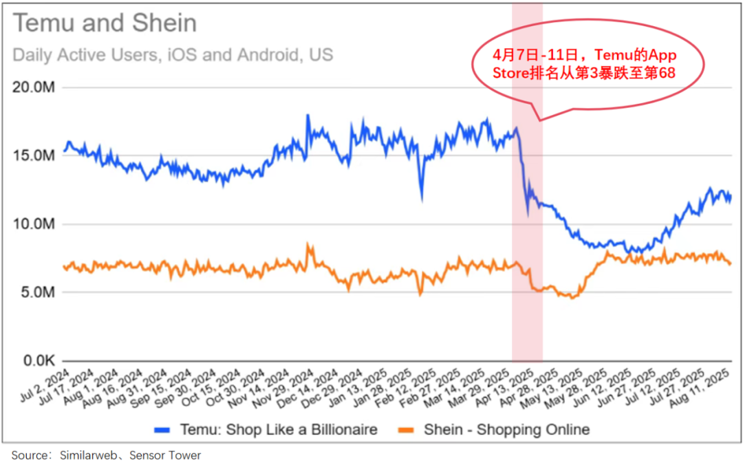 但今年4月,Temu停止在美区使用Google Shopping广告后,其App Store 排名、月活用户数断崖式下滑,自然流量转化率更是骤降近 90%。