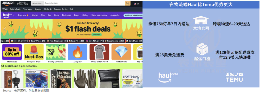 Temu自诞生伊始,面对的就是一片红海混战,亚马逊、速卖通们不可能坐视其强大。拿亚马逊低价商城Haul来说,“1 美元热卖专区”“3 美元以下商品无权退货”等策略针对性拉满;且土生土长的Haul,物流也更有性价比。