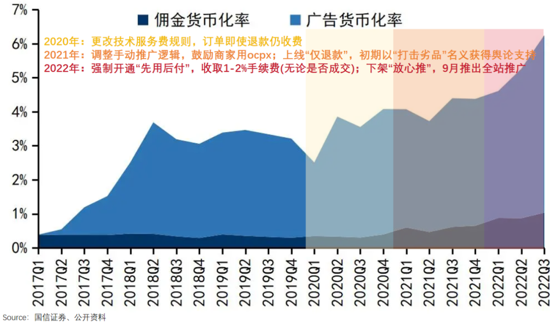 拼多多也如此,2020-2022年向商家的索取越来越重,货币化率明显上涨。据国信证券数据,其2023年take rate已逼近6%,而阿里历史上最高也未超过5%。