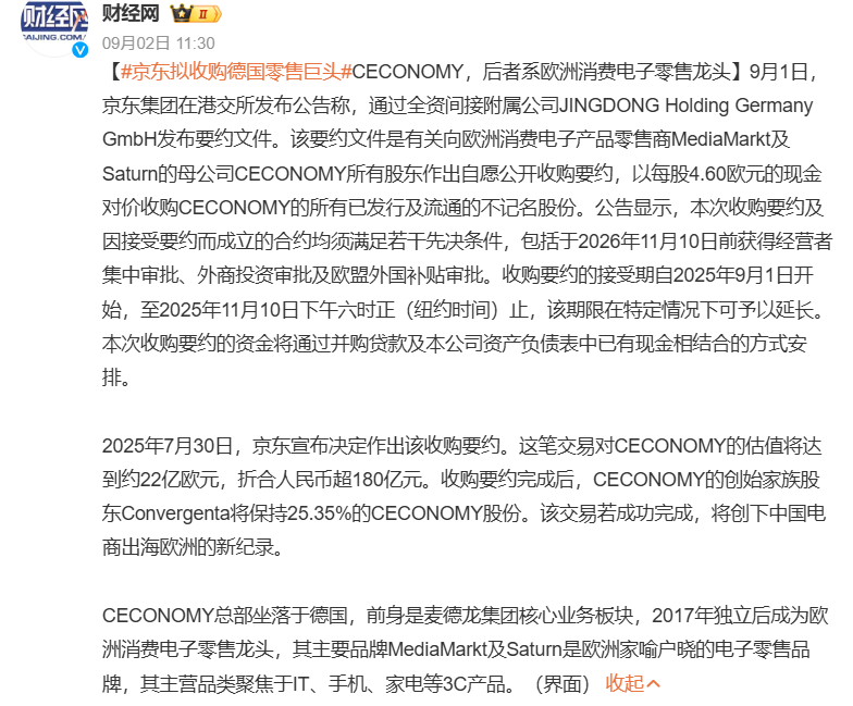 今年 7 月,京东向欧洲消费电子零售龙头企业 CECONOMY 发出收购要约,对其估值近 22 亿欧元,目前已获德国监管机构批准。刘强东今年曾公开表示,国际业务是京东未来最重要的发展重点之一,如今京东在欧洲的基建已完成大半,大约明年能开始营业。