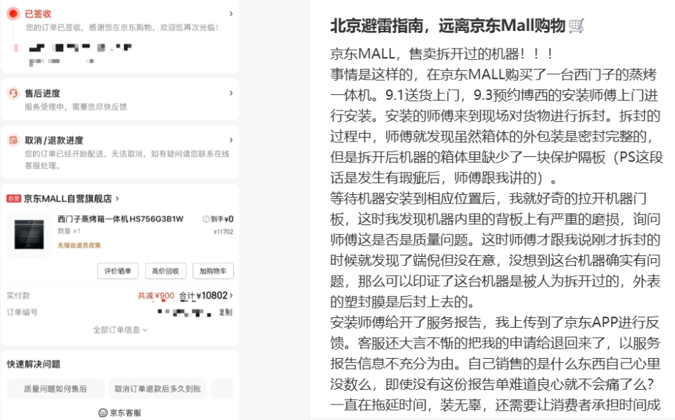 还有很多网友在社媒平台发布了“ 踩坑” 经历,吐槽京东 MALL 和京东官方客服来回推诿扯皮,导致售后体验极差,并质疑京东 MALL 和京东的服务不是一回事。