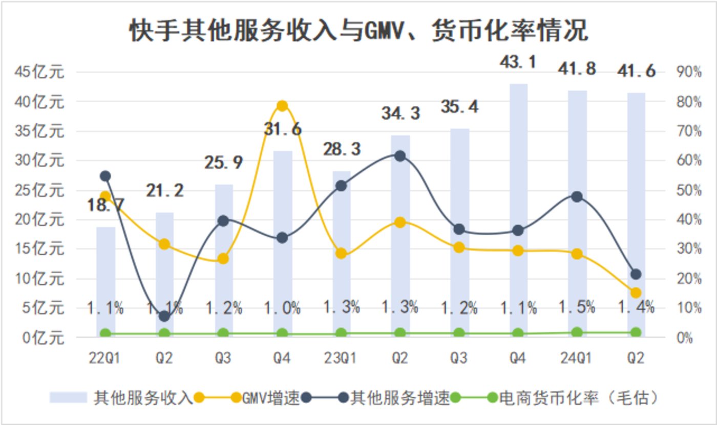 考虑到上述各家中,快手电商 GMV 增速不及基数更高的抖音电商,15% 的增速只能说中规中矩。纵向对比此前多个季度,其他服务收入与 GMV 增速双降,除宏观因素外有一部分原因是受到了供给侧的两个挑战。