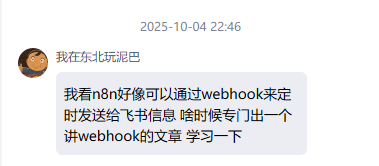 他问:“ 我看 n8n 好像可以通过 webhook 来定时发送给飞书信息,啥时候专门出一个讲 webhook 的文章学习一下?”