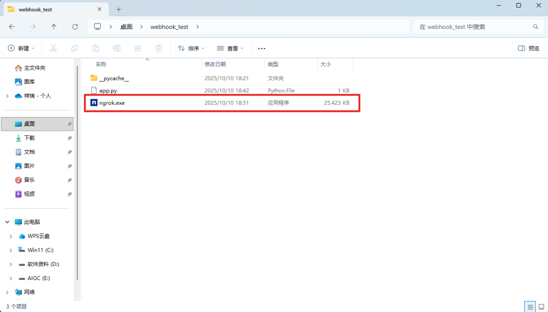 - 关键操作:把刚才解压得到的 ngrok.exe 文件,复制到这个 webhook_test 文件夹里。