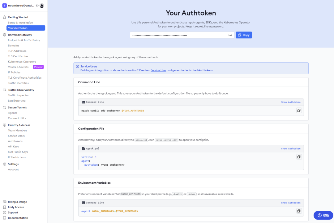 - 获取令牌 (Authtoken):访问 https://dashboard.ngrok.com/signup 注册一个免费账号 (用 Github 或 Google 登录最快)。登录后,在左侧菜单找到 “Your Authtoken”,复制那一长串令牌字符。