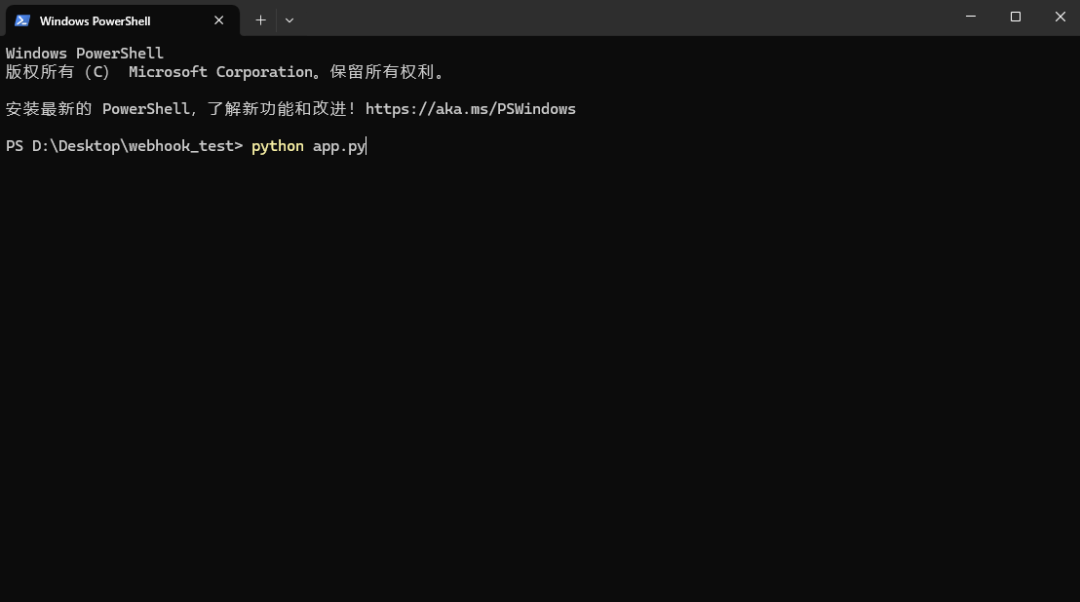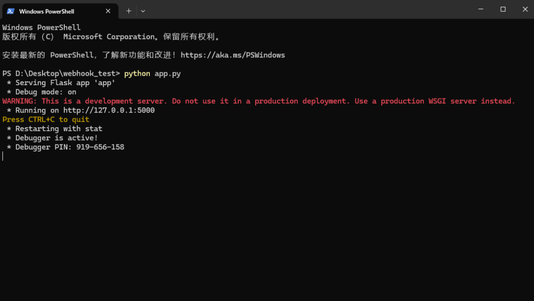 - 打开第一个命令行窗口,进入 webhook_test 文件夹,运行:python app.py
